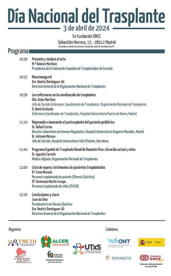 La Unión de Federaciones de Trasplantados de Órganos Sólidos (UTXs), compuesta por la Federación Nacional para la lucha contra las Enfermedades del Riñón (ALCER), la Federación Española de Trasplantados de Corazón (FETCO), la Federación Nacional de Enfermos y Trasplantados Hepáticos (FNETH) y la Federación Española de Fibrosis Quística (FEFQ), organiza un acto el próximo miércoles 3 abril con motivo del Día Nacional del Trasplante que se conmemoró el pasado 27 de marzo.